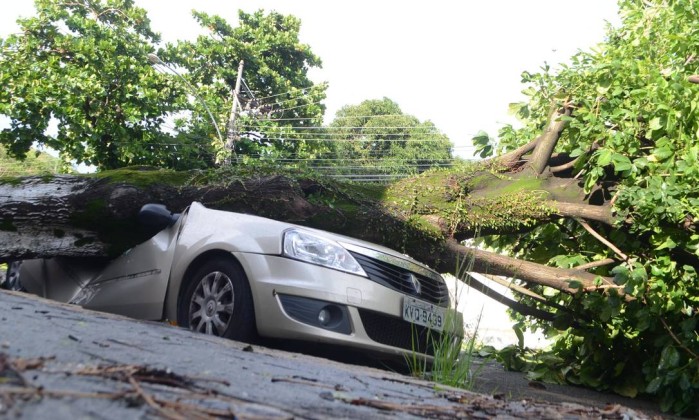 Carro esmagado em rua de Sulacap na manhã seguinte ao temporal na cidade do Rio. Foto: Luiz Gomes/Fotoarena / Agência O Globo